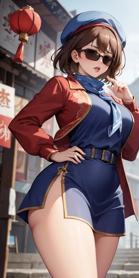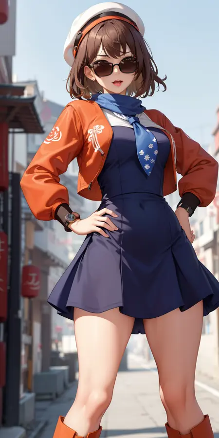 Regulus, short hair, brown hair, long sleeves, dress, jacket, scarf, neckerchief, blue dress, white hat, (sunglasses:1.2), wristwatch, bangs,