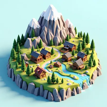 등각 3D 풍경 모델, 알프스 마을, 목재 코티지, 눈 덮인 봉우리, 상록수 숲, 굽이치는 시냇물.