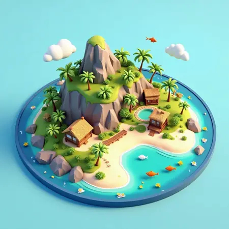 등각 3D 풍경 모델, 열대 섬, 모래사장, 야자수, 처마지붕 오두막, 푸른 라군, 화려한 물고기.