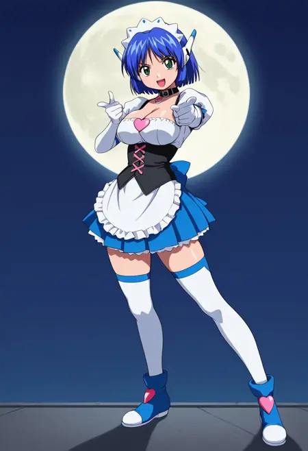 복장 03 (티라미수): 메이드 헤드리스, 흰색 프릴이 달린 검은 벨트 칼라, 로봇 귀, 흰색 프릴이 달린 푹신한 짧은 소매, 파란색 액센트와 소매에 분홍색 심장이 달린 흰색 팔꿈치 장갑, 허리 앞 심장 액세서리, 가슴 노출, 아랫가슴 코르셋, 파란색 주름치마, 파란색 액센트가 달린 흰색 프릴 허벅지 긴 양말, 분홍색 심장이 달린 파란색 액센트가 있는 흰색 발목 부츠,