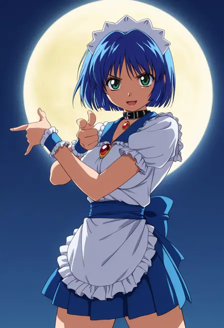 복장 02: 메이드 헤드리스, 흰색 프릴이 달린 검은 벨트 칼라, 뒤에 리본이 달린 파란색 스카프, 흰색 프릴이 달린 파란색 주름치마, 심장 모양 비즈가 달린 프릴이 있는 선원 칼라, 파란색 프릴이 달린 푹신한 짧은 소매, 흰색 프릴이 달린 허리 앞치마, 펌퐁(옷), 프릴이 달린 손목, 흰색 프릴이 달린 허벅지 긴 양말, 분홍색 심장이 달린 파란색 액센트가 있는 흰색 발목 부츠,