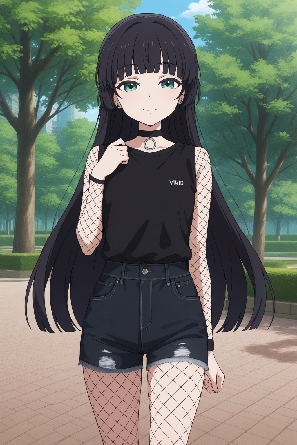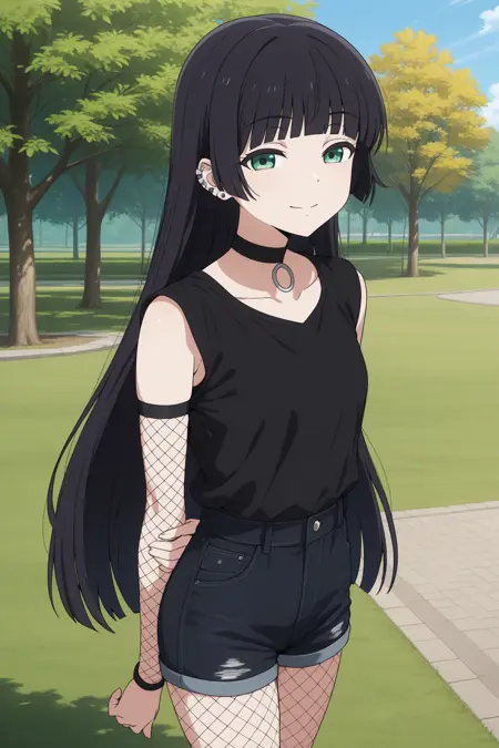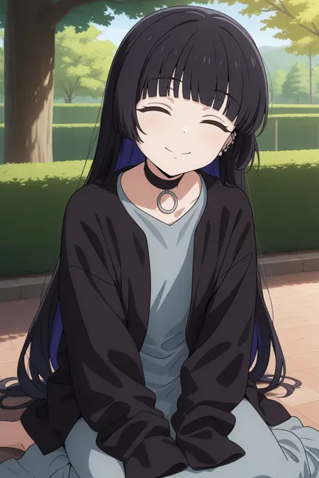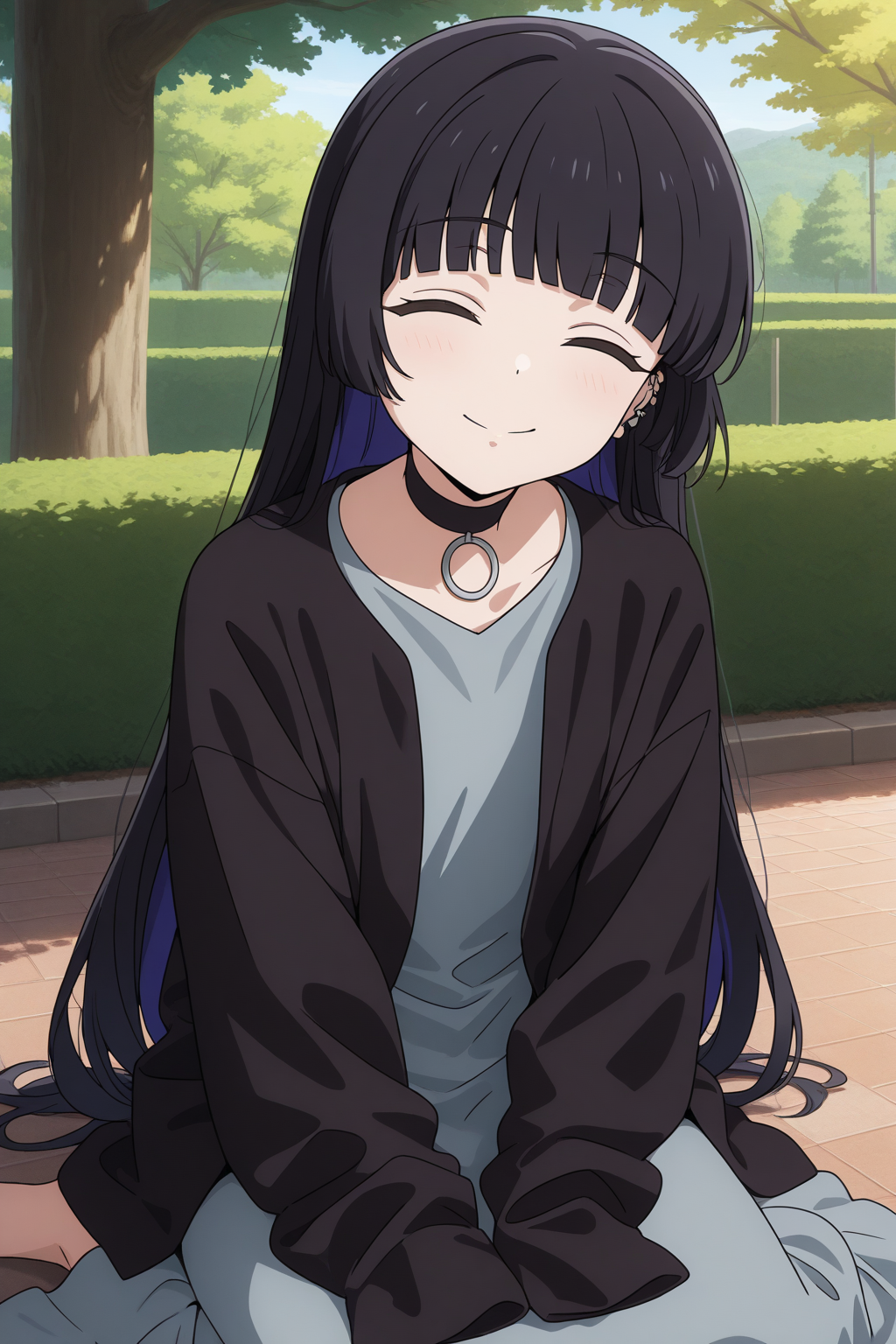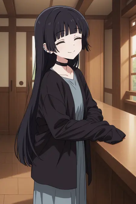 aapa, green eyes, black hair, hime cut, blunt bangs, ear piercing, black choker, padef, grey dress, long dress, black cardigan, sleeves past fingers, anime coloring,