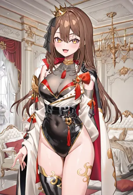 mina_aoyama,1girl,solo,brown hair,long hair,hair between eyes,virtual youtuber,yellow eyes,asymmetrical clothes,long sleeves,detached sleeves,cleavage,gold trim,tassel,black leotard,see-through cleavage,covered navel,black belt,cape,single thighhigh,asymmetrical legwear,black thighhighs,leg tattoo,mini crown,hair ornament,see-through,claw ring,