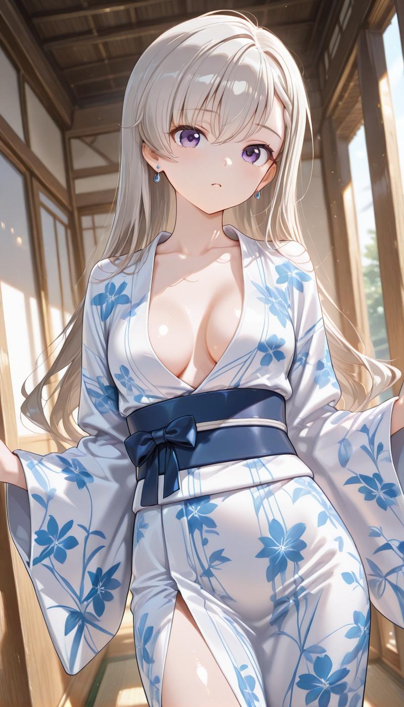 긴 소매, 가슴 사이 틈, 보석, 쇄골, 귀걸이, 일본 옷, 넓은 소매, 기모노, 띠, 꽃무늬, 오비, 가슴 분리, 흰 기모노, 유카타, 무늬 기모노, 파란 띠, 파란 기모노, 허벅지,