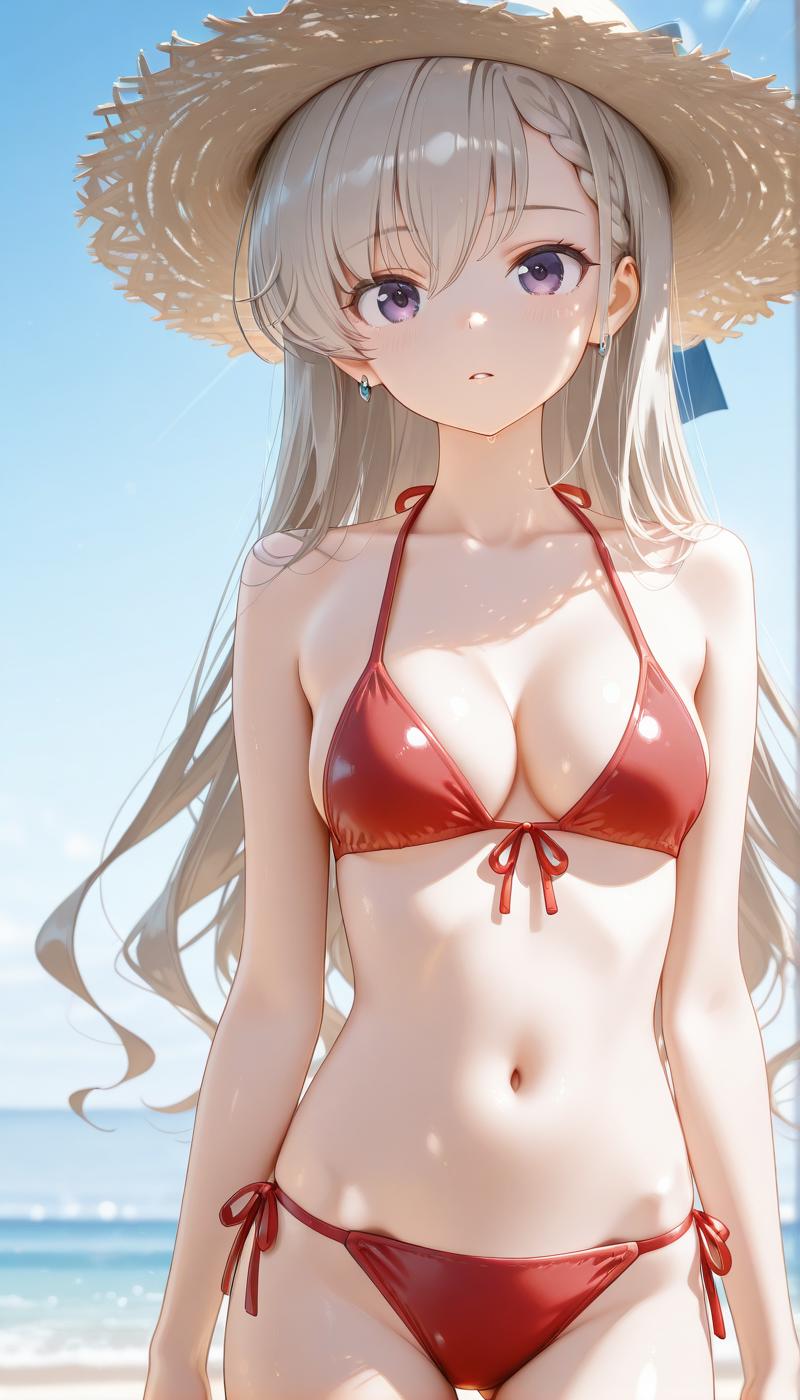 모자, 배꼽, 리본, 가슴 사이 틈, 보석, 어깨 드러남, 쇄골, 수영복, 귀걸이, 비키니, 복부, 옆가슴, 옆매듭 비키니 하의, 할터넥, 허벅지 사이로 엉덩이 보임, 허벅지 틈, 스트링 비키니, 앞매듭 탑, 빨간 비키니, 햇빛 모자, 앞매듭 비키니 탑, 짚 모자, 갈색 머리 장식, 허벅지,