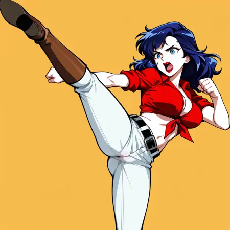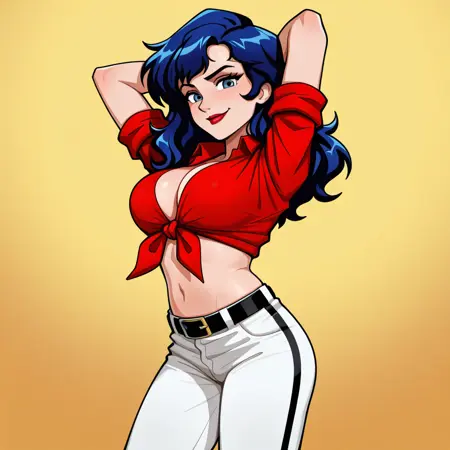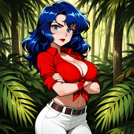 HannahDundee, 1girl, solo, large breasts, red lips, blue eyes, blue hair, long hair, red shirt, tied shirt, midriff, sleeves rolled up, pants, white pants, belt