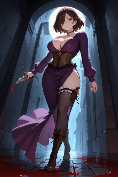 그녀의 전형적인 외모를 위해 "검은 목걸이, 보라색 드레스, 긴 소매, 흉부 노출, 갈색 코르셋, 옆 슬릿, 검은 허벅지 양말, 주름진 허벅지 양말, 끈 매듭 부츠, 갈색 부츠"를 추가하세요.