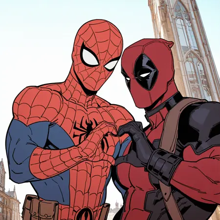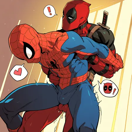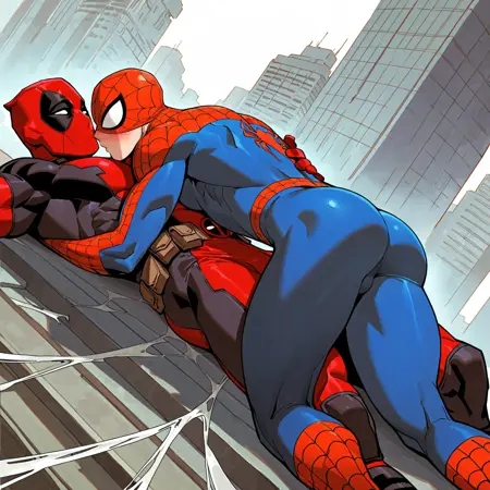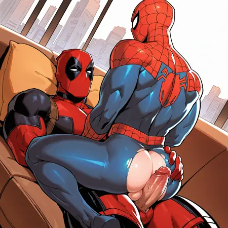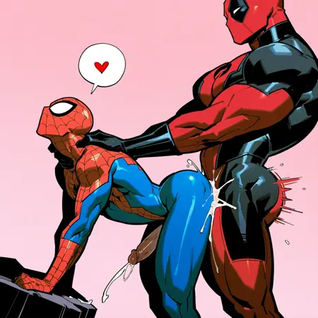 <lora:SXD:1> spiderman_deadpool, male focus, multiple boys, 2boys, mask, bodysuit, superhero, red bodysuit, yaoi, muscular, spider web print, two-tone bodysuit, blue bodysuit, muscular male, bara, pectorals, ass, simple background, gloves, large pectorals, short hair, penis, anal, sex