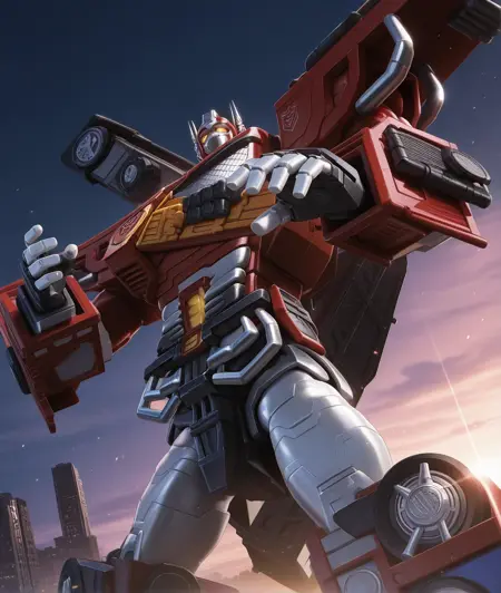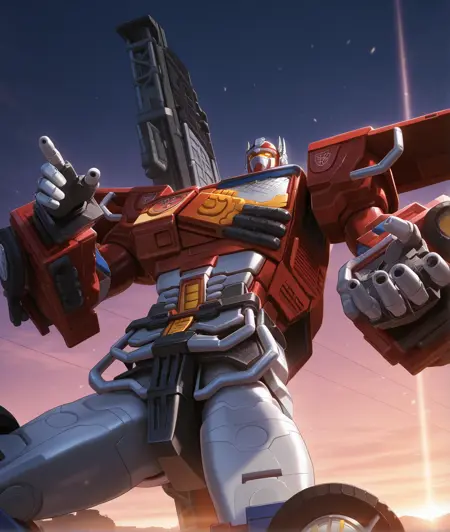 SFconvoy, robot, super robot, outdoor, solo, asymmetrical weapon, yellow eyes, glowing eyes, transformers,