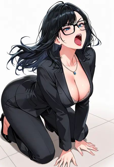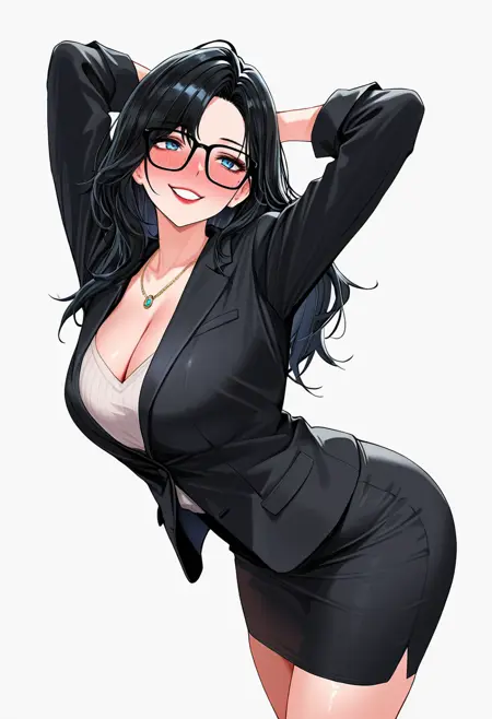 manager_cnr, 1girl, black hair, long hair, blue eyes, large breasts, mole, black-framed eyewear, mature female,