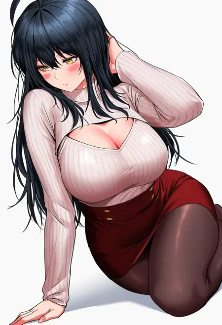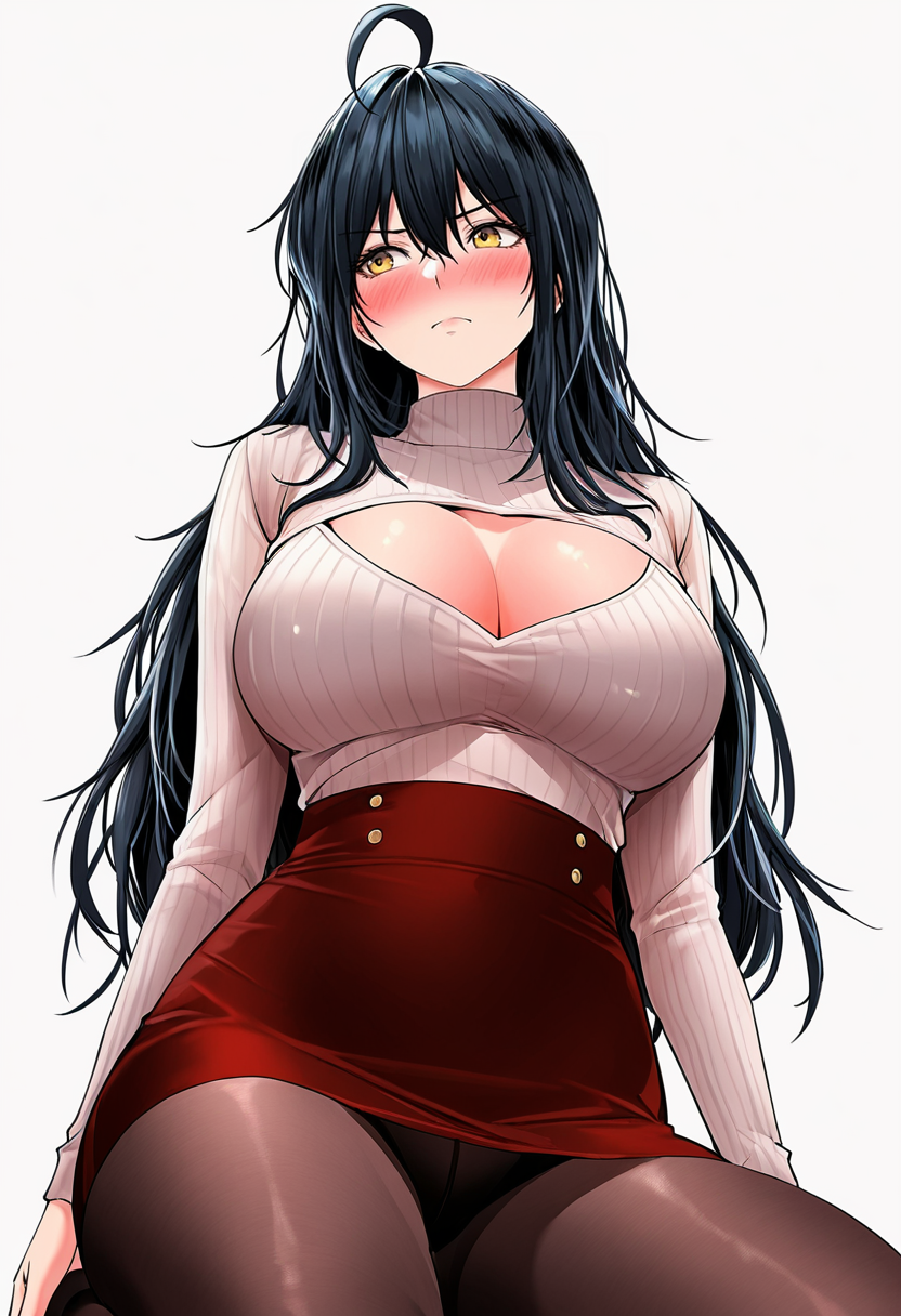 red skirt, high-waist skirt, pantyhose, pencil skirt, turtleneck, open-chest sweater, cleavage cutout,