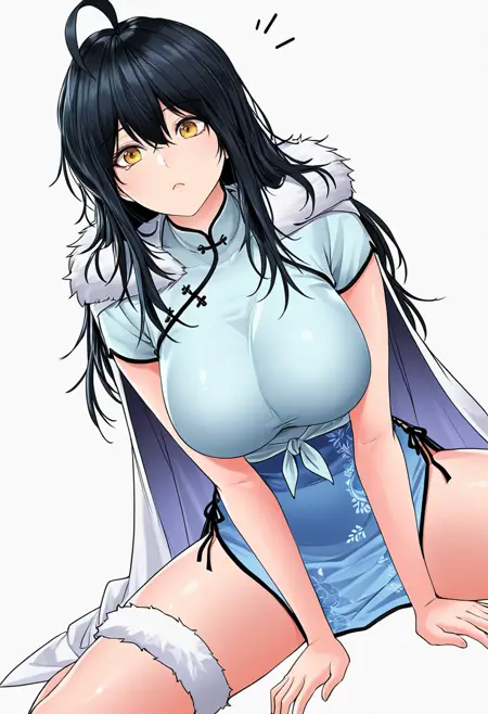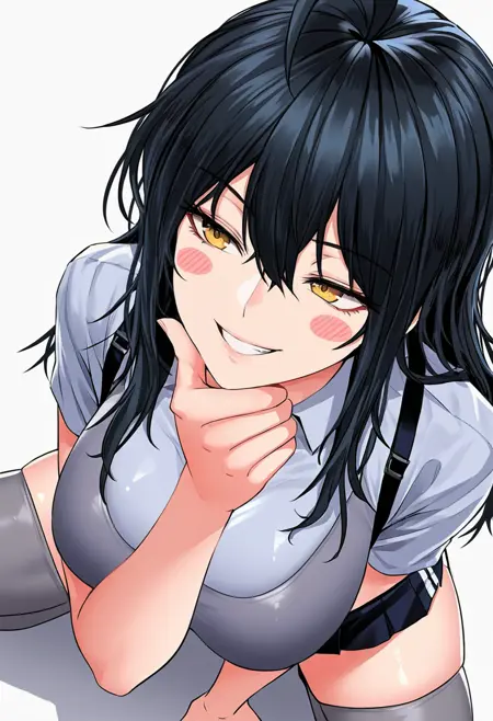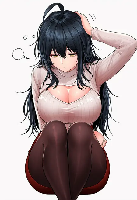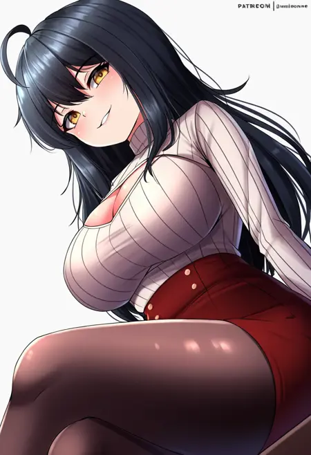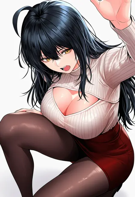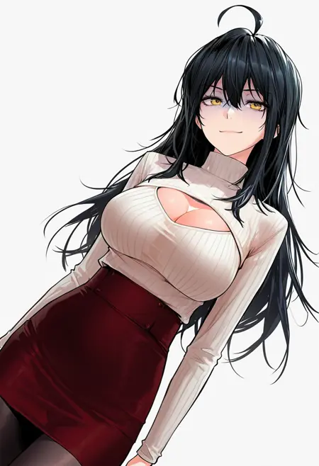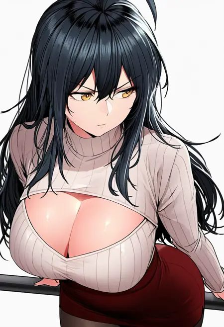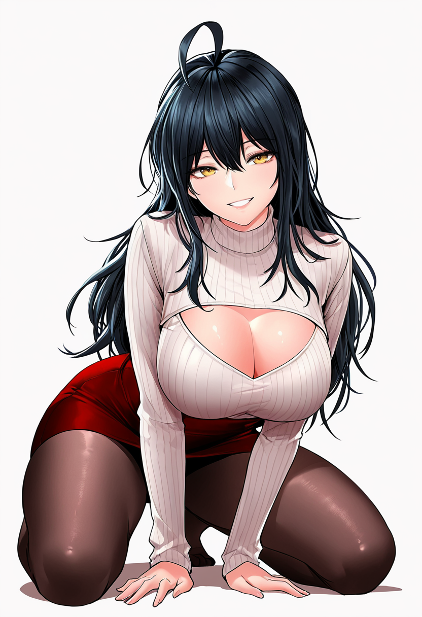 juyeon_cnr, 1girl, black hair, long hair, yellow eyes, large breasts, hair between eyes, ahoge,