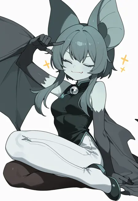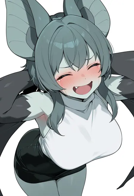 bat_cnr, 1girl, colored skin,bat girl, grey skin, short hair with long locks, bangs, fang, bat ears, black gloves, winged arms,
