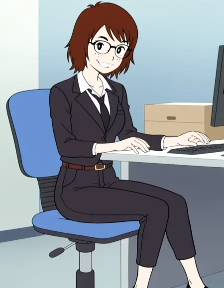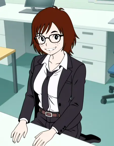 服装2:白色衬衫,黑色领带,黑色夹克,黑色长裤,腰带,黑色鞋子,办公室女性,眼镜,