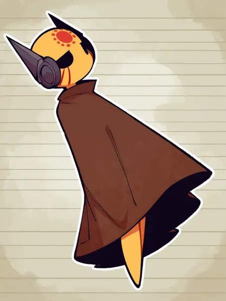 it-sos, 이마 마크, 이마 X 마크, 흰색 몸체, 검은색 눈, 주황색 망토, 로봇 귀, 안테나 없음