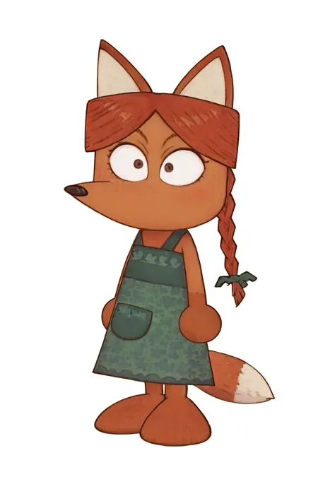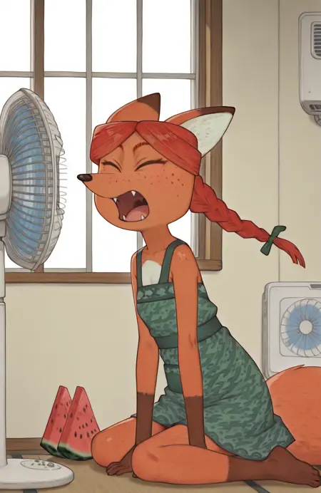 zh1hrkfx, furry, orange body, fox ears, green dress, brown eyes, fangs, red hair, braid with a bow