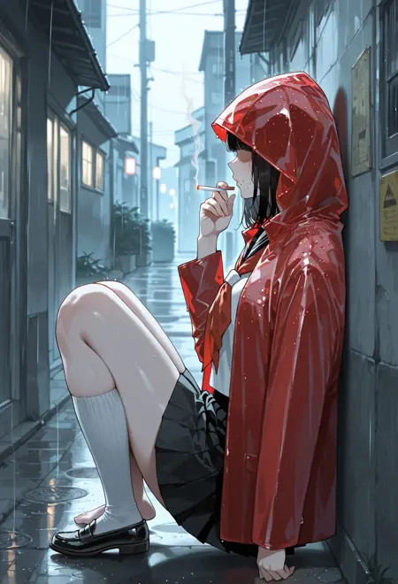 red raincoat, see-through raincoat, hood, hood up, school uniform, serafuku, summer uniform, white shirt, sailor collar, red neckerchief, black skirt, pleated skirt, white socks, kneehighs, black footwear, single shoe, penny loafers