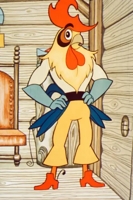 petuh, bird, chicken, rooster, red comb, red wattle, yellow fuzzy chest, blue tail, orange thin legs,