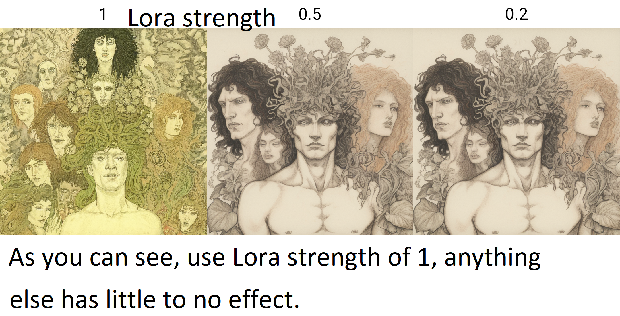- 请使用 lora:Austin_Osman_Spare_1.1:1,设置为 1 为默认调优值,可获得最准确的风格效果。