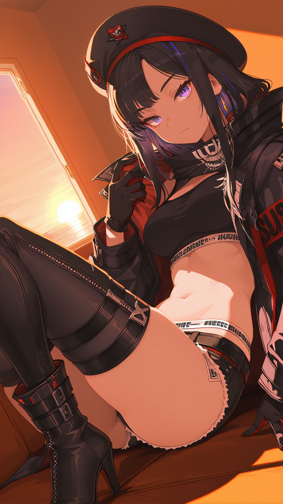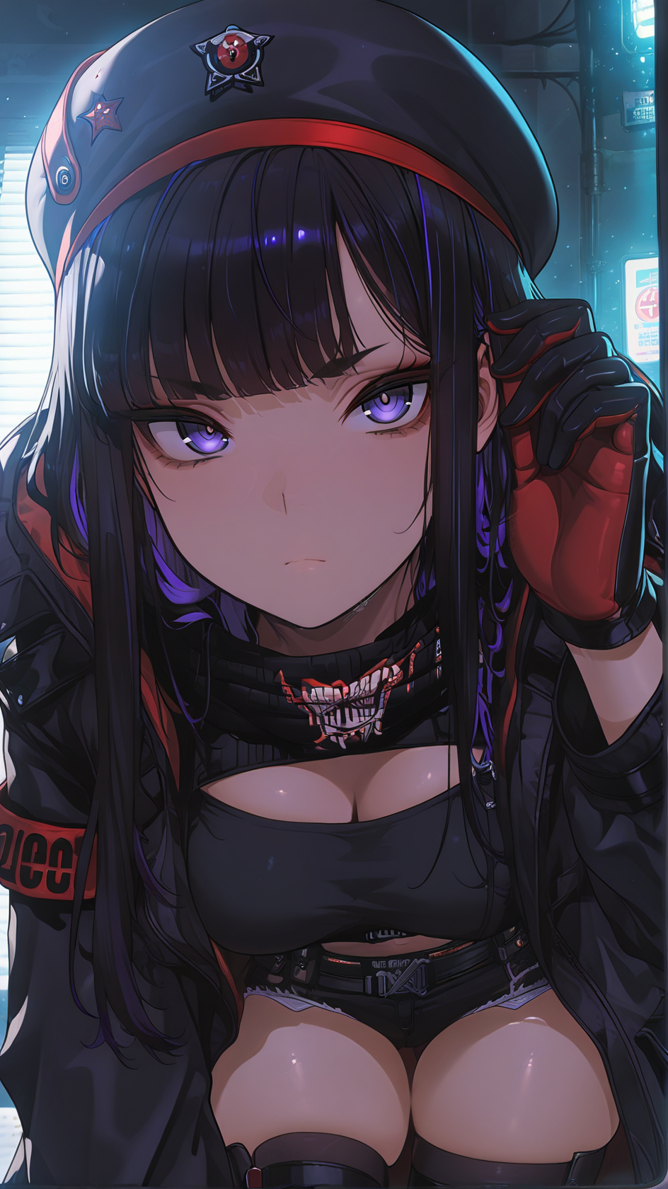 例プロンプト:eunhwaos,long hair, breasts,bangs, blue eyes, black hair, thighhighs, gloves, long sleeves, hat, navel, purple eyes, jacket, multicolored hair, boots, open clothes, shorts, midriff, belt, black thighhighs, stomach, open jacket, streaked hair, black jacket, short shorts, gradient hair, skindentation, thigh strap, beret, black shorts, red gloves, high heel boots, micro shorts, two-tone gloves,