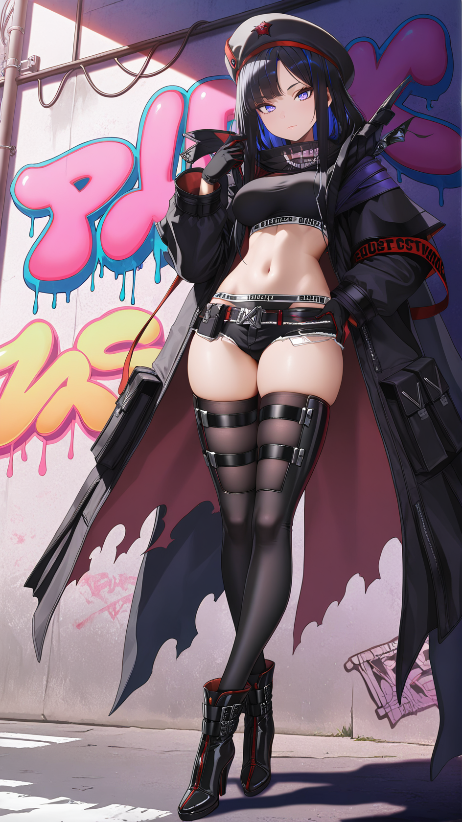 例プロンプト:long hair, bangs, blue eyes, shirt, black hair, thighhighs, gloves, long sleeves, hat, navel, purple eyes, jacket, thighs, multicolored hair, boots, open clothes, shorts, midriff, belt, black thighhighs, stomach, bag, black footwear, high heels, open jacket, streaked hair, black jacket, crop top, short shorts, black headwear, skindentation, thigh strap, beret, black shorts, red gloves, high heel boots, black coat, micro shorts, , two-tone gloves,