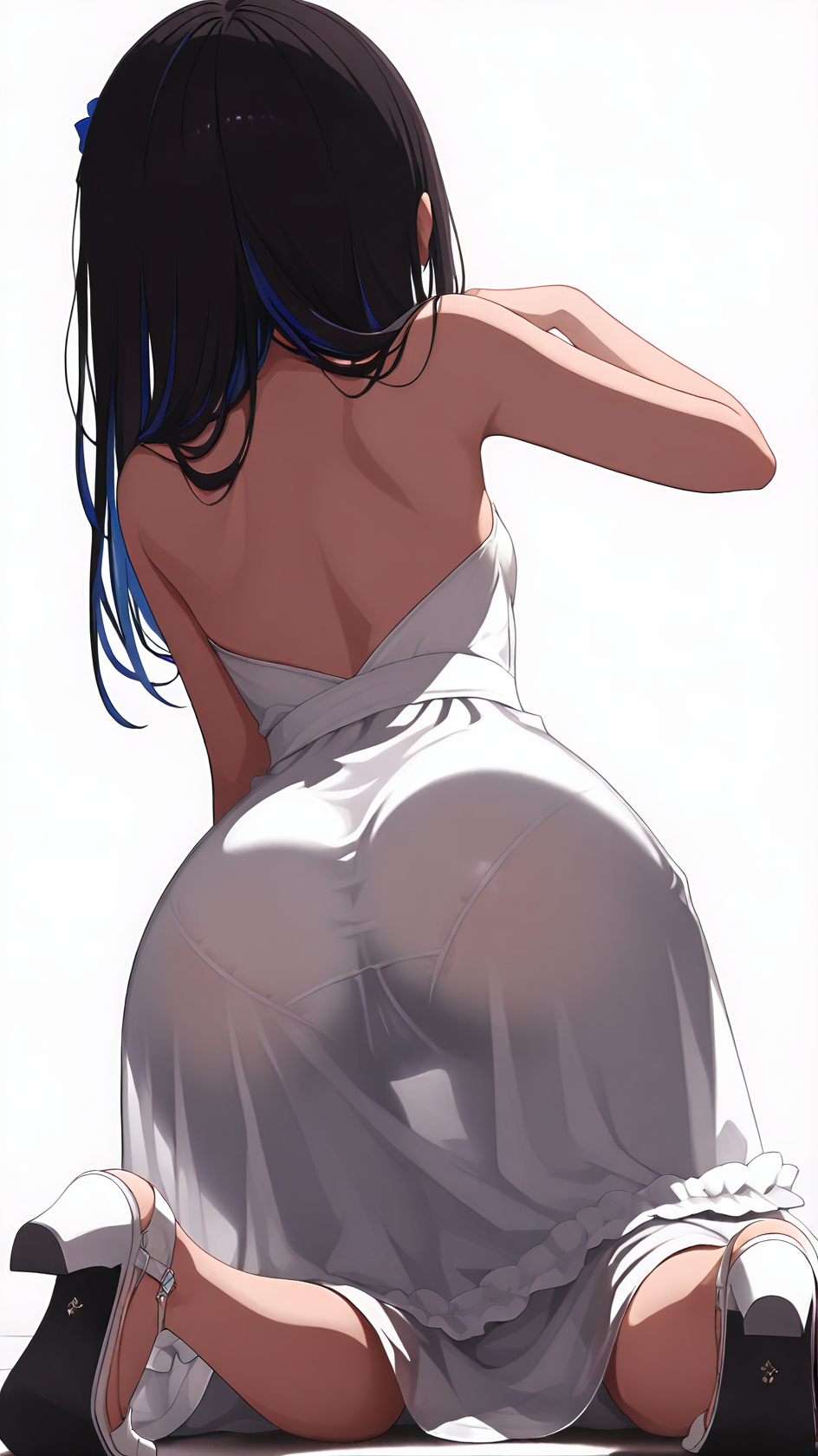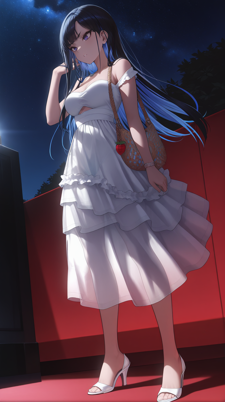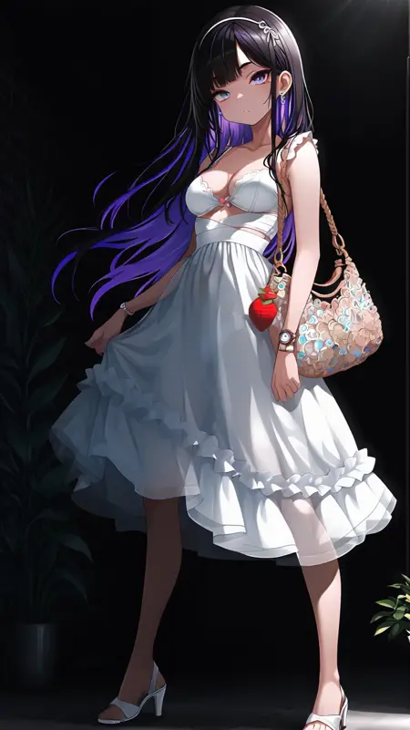 示例提示词:1girl,长发,乳房,刘海,蓝眼睛,黑发,发饰,连衣裙,乳沟,裸肩,珠宝,中等大小乳房,极长发,内衣,紫眼睛,锁骨,紫发,多色发,发带,耳环,荷叶边,无袖,包,胸罩,白色连衣裙,高跟鞋,手镯,双色发,透明,裸臂,水果,无袖连衣裙,凉鞋,白色鞋履,荷叶边连衣裙,白色胸罩,手表,单肩包,内发染色,腕表