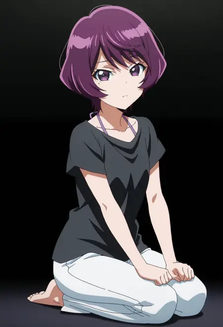 1girl, solo, haruka kaibara, short hair, mole, mole under eye, purple eyes, purple hair, bangs