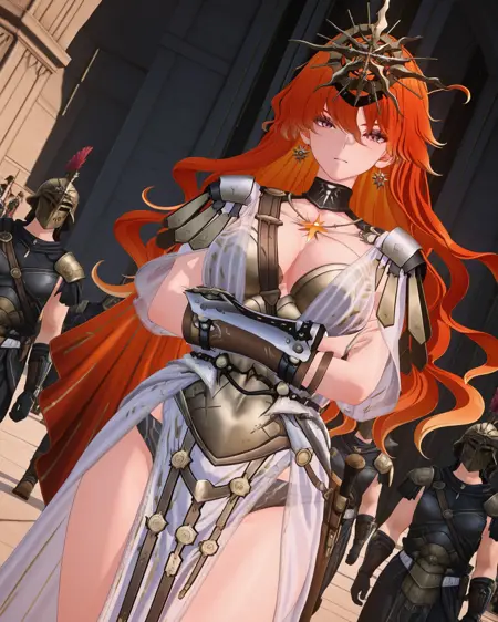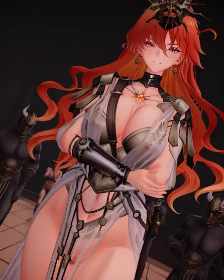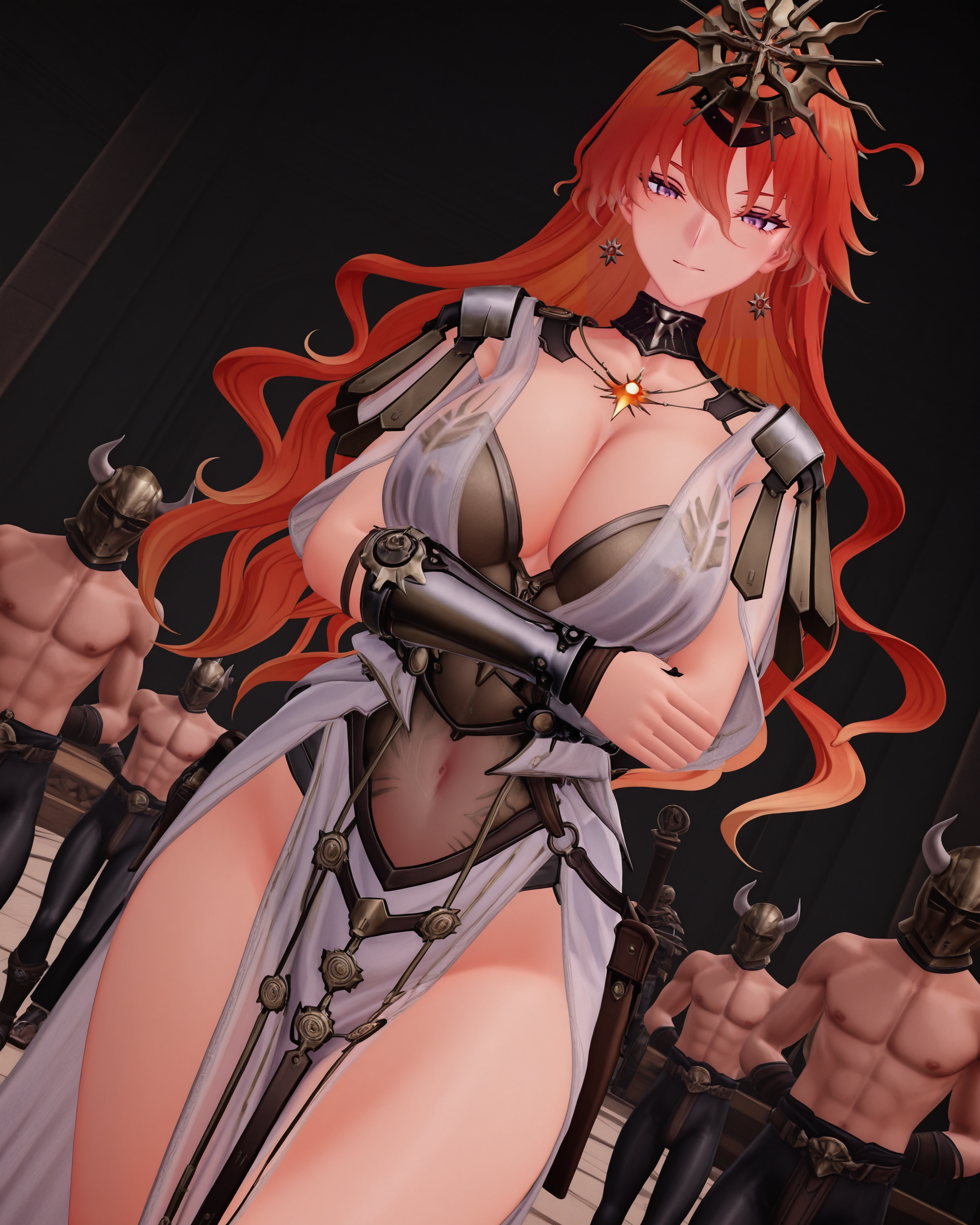 augusta,mature female,mmd,3d,1girl,jewelry,earrings,1girl,breasts,long hair,multiple boys,helmet,armor,cleavage,orange hair,red hair,standing,large breasts,solo focus,looking at viewer,see-through,gauntlets,dress,