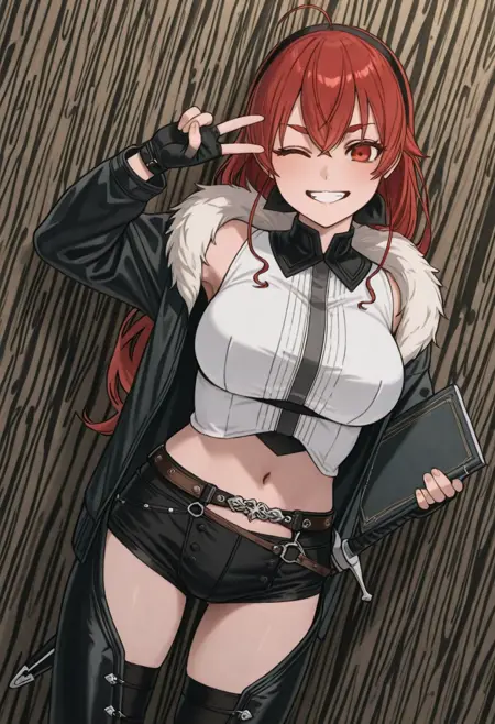 黒いヘアバンド、開いたジャケット、ファー縁取りのジャケット、腹部露出、衿付きシャツ、ノースリーブシャツ、胸下部、ベルト、短いショートパンツ、チャップス、ももまである長靴、鞘納め、フィンガーレスグローブ、黒い靴