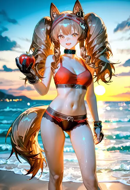 内衣:1girl(Arknights_Angelina,长发,中等胸围,张嘴,肚脐,Arknights_Angelina狐狸耳朵,Arknights_Angelina狐狸尾巴,Arknights_Angelina棕色眼睛,露胸,双马尾,站立,Arknights_Angelina内衣,完美手部,完美脚部)