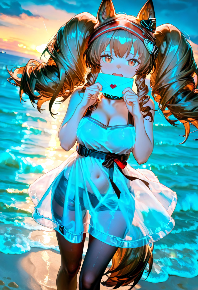 可爱连衣裙:1girl(Arknights_Angelina,长发,大胸围,项圈,张嘴,不安,Arknights_Angelina棕色头发,Arknights_Angelina棕色眼睛,肚脐,Arknights_Angelina狐狸耳朵,露胸,双马尾,站立,裤袜,丝带,手持,露肩,双马尾,站立,红色发带,无袖白裙,透视,露臂,掩嘴,手持信件,完美手部,完美手部,完美脚部)