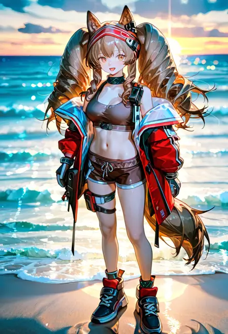 运动装:1girl(Arknights_Angelina,长发,中等胸围,张嘴,Arknights_Angelina棕色头发,肚脐,Arknights_Angelina狐狸耳朵,Arknights_Angelina棕色眼睛,露胸,双马尾,站立,夹克,Arknights_Angelina狐狸尾巴,全身,Arknights_Angelina运动服装)
