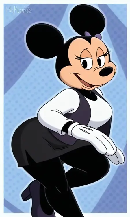 태그: HM_minnie, 검정 털, 검정 눈, 흰 장갑, 보라색 리본 핀, 흰색 긴 소매 셔츠, 검정-보라색 조끼, 검정 치마, 보라색 힐과 보라색 커프스,