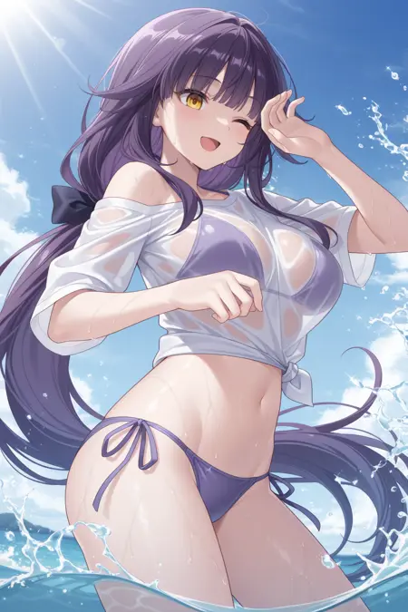 低马尾,发带,紫色比基尼,侧系带比基尼,白色衬衫,系带衬衫,露脐装,透视,露肩,短袖