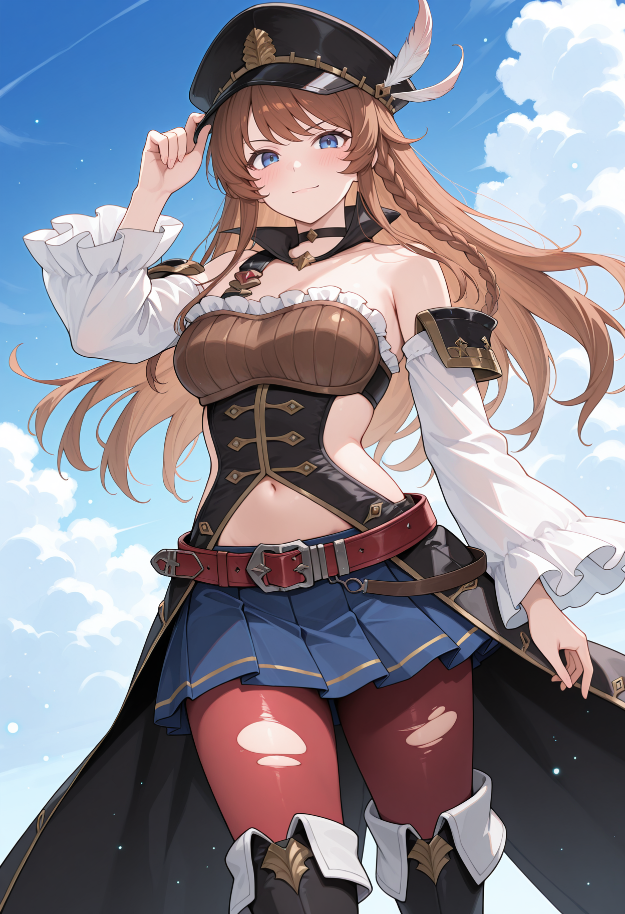 gblecdef, 한쪽 꼬리, 옆 꼬리, 뾰족한 모자, 모자 깃털, 목걸이, 분리형 칼라, 갈색 가슴, 한쪽 끈, 검은 코트, 측면 절개, 주름진 방한복, 허리, 분리형 소매, 흰색 소매, 벨트, 주름치마, 파란 치마, 미니스커트, 찢어진 테이프 양말, 빨간 테이프 양말, 허벅지 부츠,