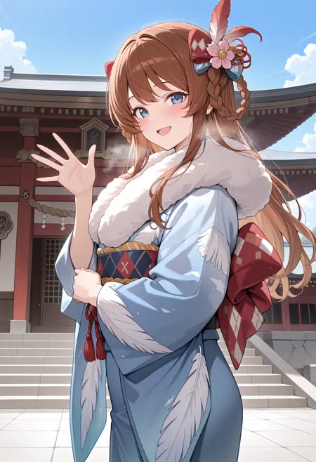 - 파란 기모노, 땋은 머리 고리, 머리 리본, 머리 꽃, 깃털 무늬, 털 장식, 띠, 애글레이 패턴 옷,