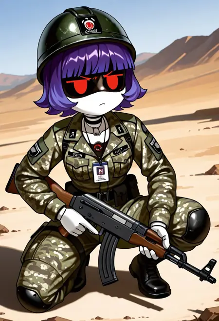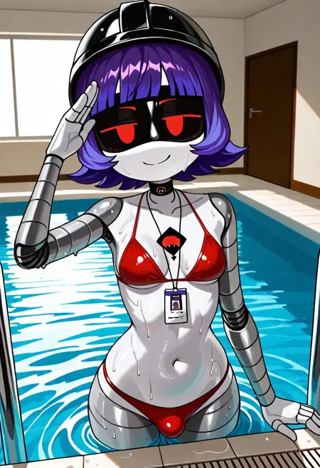 프롬프트: YevaMD, 1girl, solo, 빨간 눈, 색깔 있는 공막, 보라색 머리, 단발, 앞머리 끝이 곧음, 헬멧, 가슴 마크, 아이디 카드 목걸이, 로봇형.