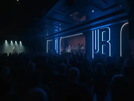 WD, 이 매혹적인 이미지는 세련된 분위기의 현대적이고 약간 어두운 바를 보여준다. 중심에는 화려한 파란색과 흰색으로 표시된 "BAR CLUB"라는 네온 사인으로, 도시적인 감각을 더한다. 바는 광택 있는 목재 카운터와 세 개의 하이 스툴로 구성되어 캐주얼한 좌석 공간을 제공한다. 배경에는 부드러운 조명이 비치는 무대 영역이 있어 라이브 공연을 암시한다. 전반적인 미학은 현대적이고 세련되어 트렌디한 소셜 모임에 이상적이다.