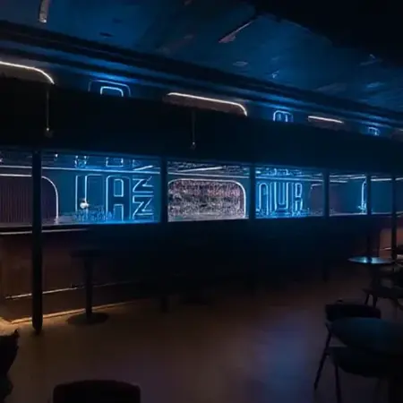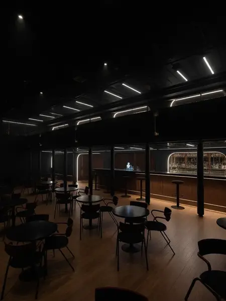 WD, 이 분위기 있는 어두운 바는 라이브 음악 애호가들을 위한 쾌적하고 친밀한 분위기를 갖추고 있다. 방은 둥근 어두운 목재 테이블과 매칭되는 의자로 장식되어 따뜻하고 환영하는 좌석 공간을 조성한다. 배경에는 부드럽고 집중된 스팟라이트로 조명된 뮤지션이 활동하는 무대가 있다. 벽은 은은한 앰비언트 조명과 네온 사인으로 장식되어 빈티지 인테리어에 현대적인 느낌을 더한다. 광택 있는 목재 바닥은 전체적인 미학을 강화하여 휴식과 오락 모두에 이상적인 장소가 된다.