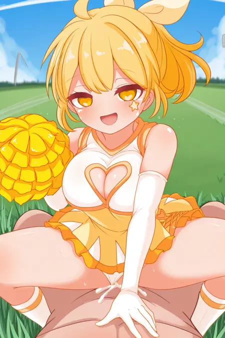 cheeryellow6135, 金髪, 黄色目, ポニーテール, 中くらいの長さの髪, ヘアボウ, 黄色のボウ, 星型の顔の模様, アホ毛,