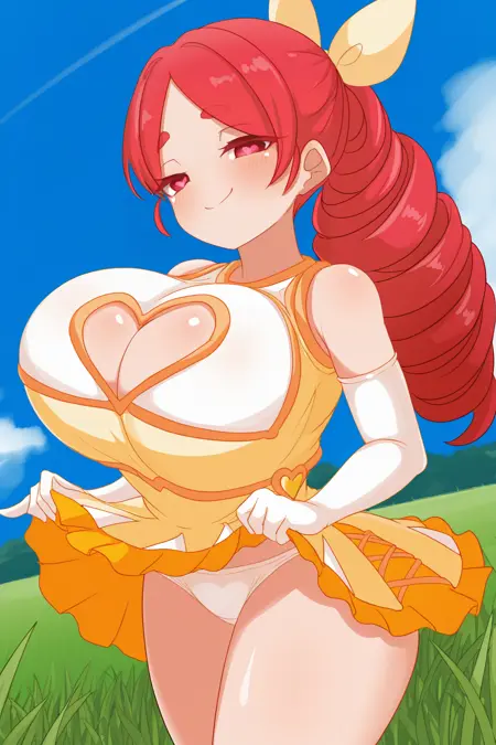 cheerred6135, 赤髪, 長髪, 分け目前髪, ドリルポニーテール, 厚い眉, 赤目, 心形の瞳, ヘアボウ, 黄色のボウ,