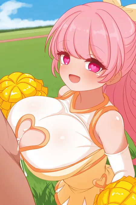 cheerpink6135, ピンク髪, 長髪, 片編み髪, 太いポニーテール, ピンク目, ヘアボウ, 黄色のボウ,
