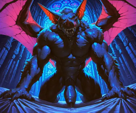タグ: g4rgoyle, monster, creature, bat nose, muscular, wings, sharp teeth, claws, pointed ears, fur, hair, digitigrade,