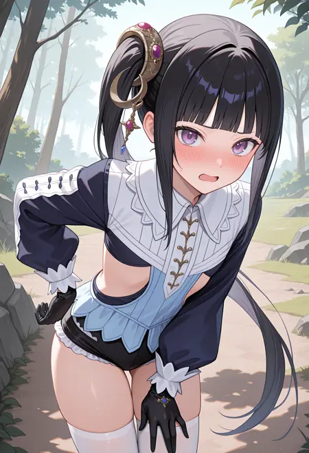 ammhdef, 非常に長い髪, 横ポニーテール, 髪飾り, 白いカラー, 長袖, レイヤードシャツ, ツートーンシャツ, 青シャツ, 黒シャツ, 白シャツ, サイドカットアウト, リブシャツ, 黒ショートパンツ, フリル付きショートパンツ, マイクロショートパンツ, 黒手袋, 白タイツ,