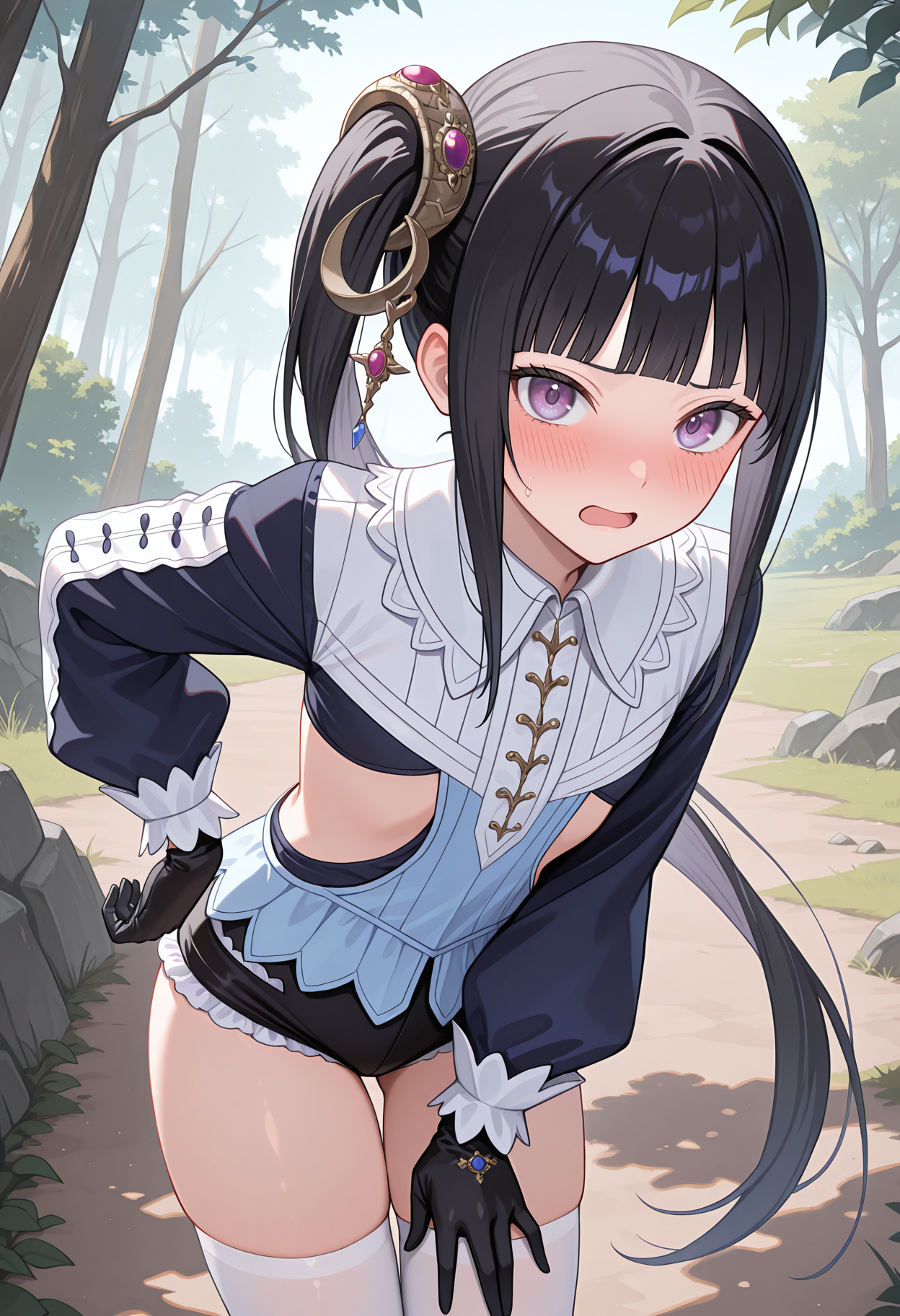 • ammhdef, 极长发, 侧马尾, 头饰, 白色领子, 长袖, 分层衬衫, 双色衬衫, 蓝色衬衫, 黑色衬衫, 白色衬衫, 侧开叉, 有领衬衫, 黑色短裤, 荷叶边短裤, 微短裤, 黑色手套, 白色过膝袜,