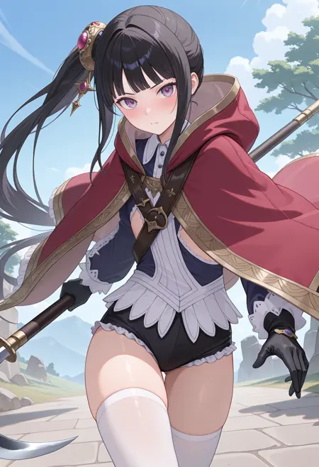 • ammhdef, 极长发, 侧马尾, 头饰, 带帽兜, 红色斗篷, 金色镶边, 长袖, 分层衬衫, 双色衬衫, 黑色衬衫, 蓝色衬衫, 白色衬衫, 侧开叉, 有领衬衫, 黑色短裤, 荷叶边短裤, 微短裤, 黑色手套, 白色过膝袜,