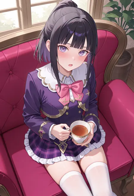 - ammhlgl, ポニーテール, ハーフアップ, 紫のジャケット, クロップドジャケット, ブレザー, ピンクのリボン, 紫のコート, 紫のスカート, チェックスカート, ミニスカート, フリルスカート, 白タイツ,