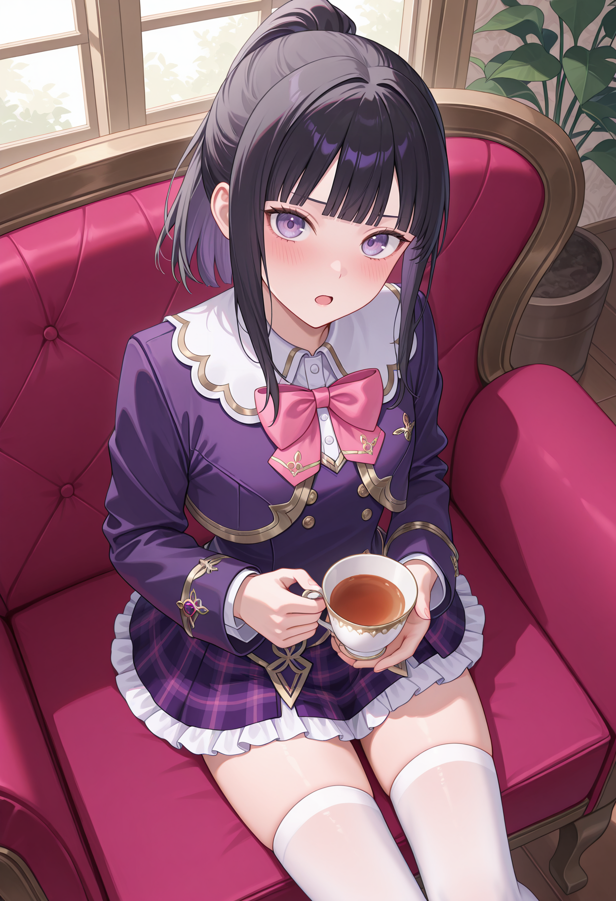 • ammhlgl, 马尾, 半扎发, 紫色夹克, 短款夹克, 西装外套, 粉色蝴蝶结, 紫色外套, 紫色裙子, 格子裙, 超短裙, 荷叶边裙, 白色过膝袜,