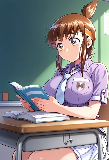 trigger words: kisematori, 1girl, brown hair, short hair, short ponytail, sidelocks, brown eyes, headband, large breasts,