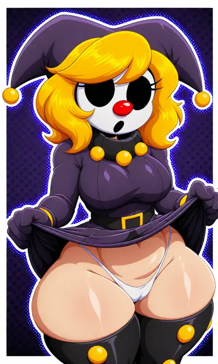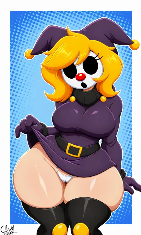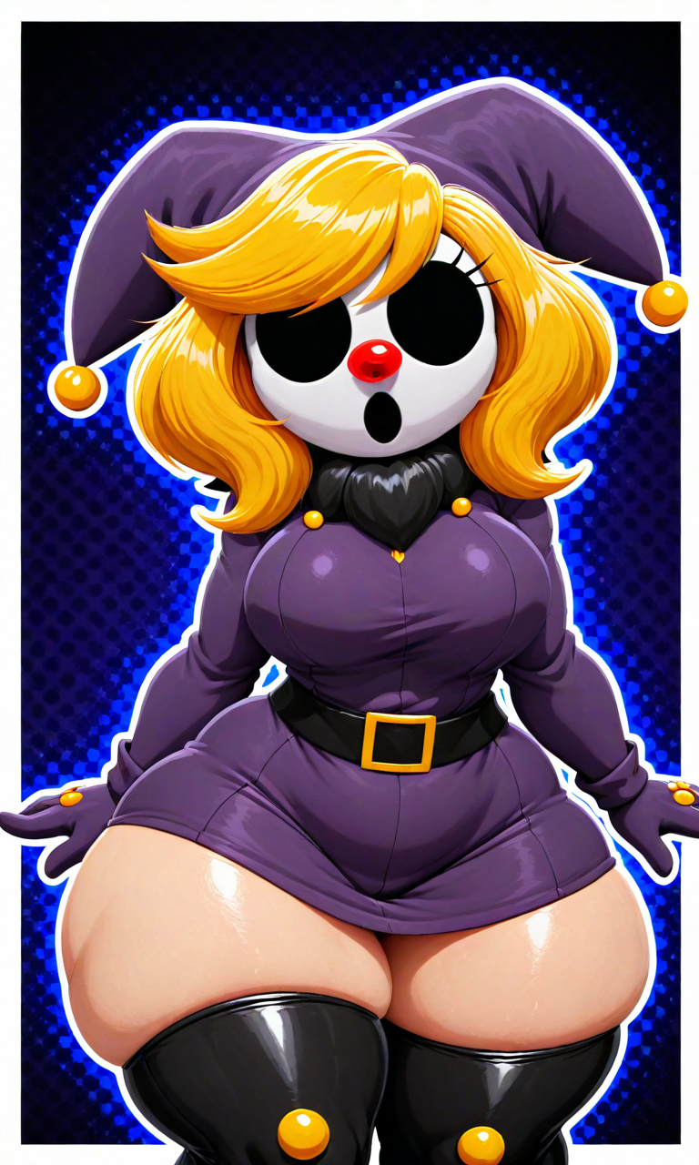 标签:cl0wngal,黄发,紫色毛衣,小丑帽,紫色斗篷,长袖,白色面具,:o,红鼻子,紫色手套,腰带,黑眼,短裙,过膝袜,靴子,